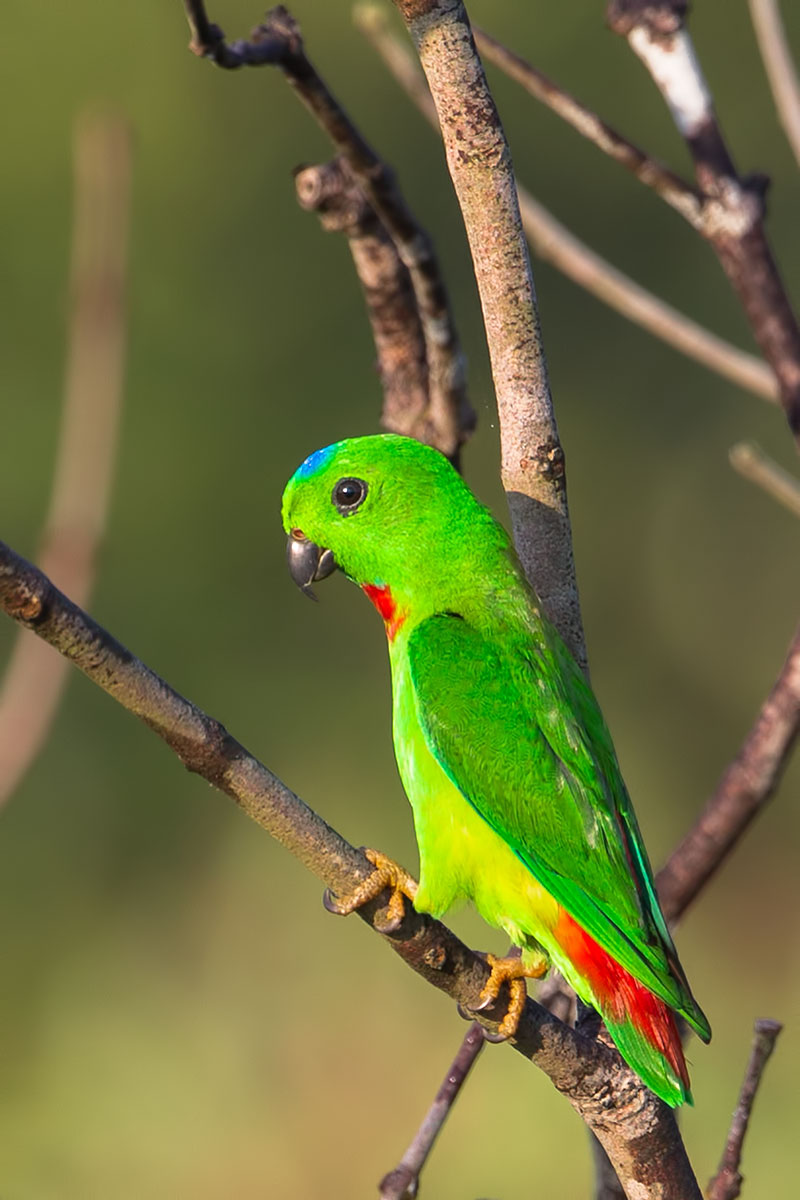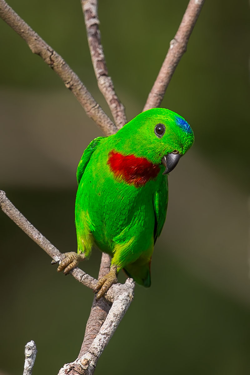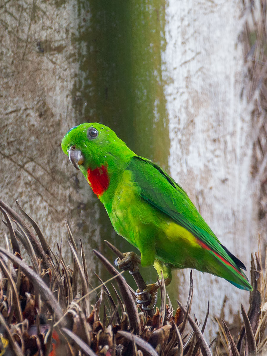 - A frontal view of the male. Very vivid green plumage, with a blue crown patch and red throat/breast area. In any patch of greenery where these parrots are found, it is always easier to find the more conspicuous male.