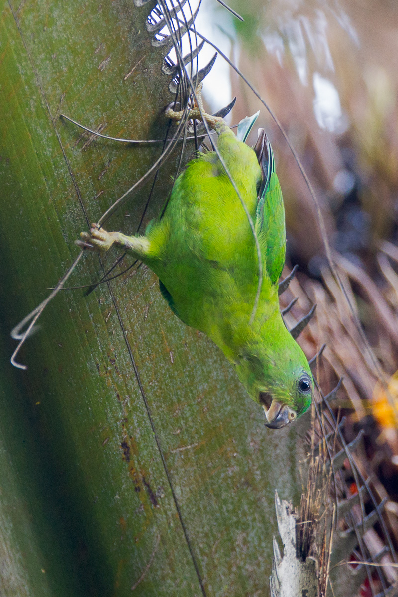 - This juvenile shows why it is called a Hanging Parrot. The bill is horn coloured and the legs are dullish yellow.