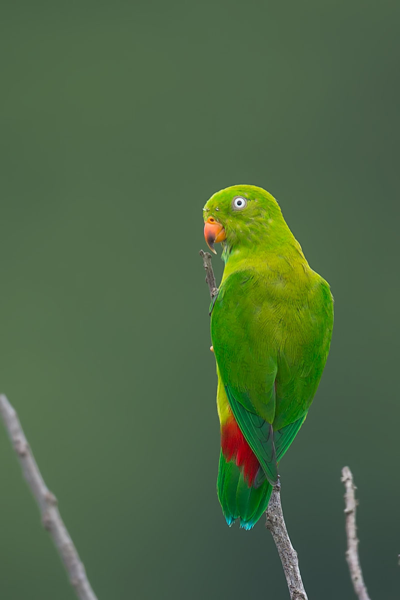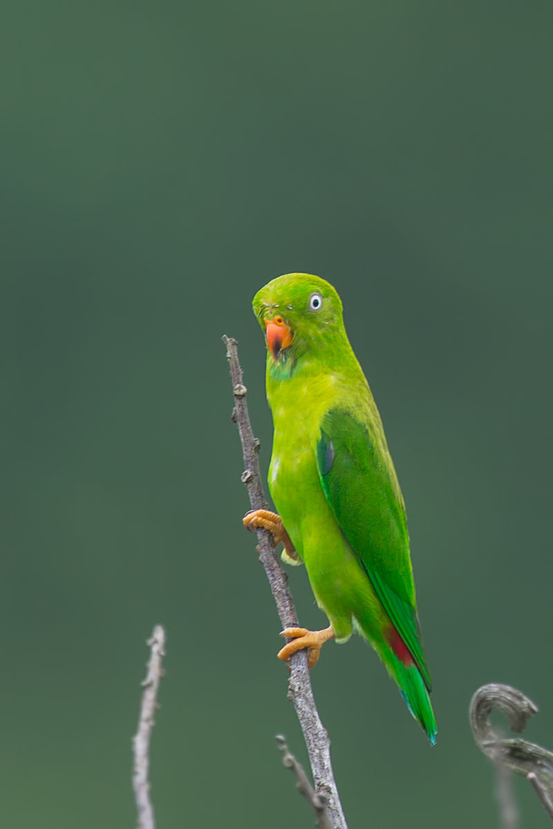 Below are some of the pictures I took. Unlike the Blue-crowned Hanging Parrots, I am not familiar with their various characteristics. In general, they have red to orange bills unlike the Blue-crowned Hanging Parrots. The breeding adults have white eyes and the male have light blue throat area. The juveniles are lighter in colour, with darker eyes, duller legs and feet.