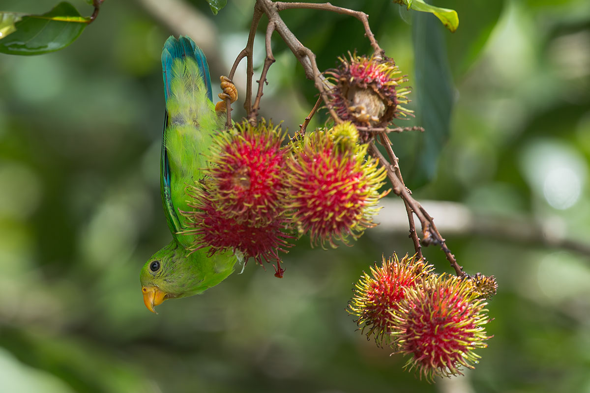While in Thailand for a birding holiday in July 2013, I had a chance to photograph some Vernal Hanging Parrots (Loriculus vernalis) at Kaeng Krachan National Park. With a bit of free time left for the day, the guide brought me to a rambutan orchard that was fruiting at the moment.