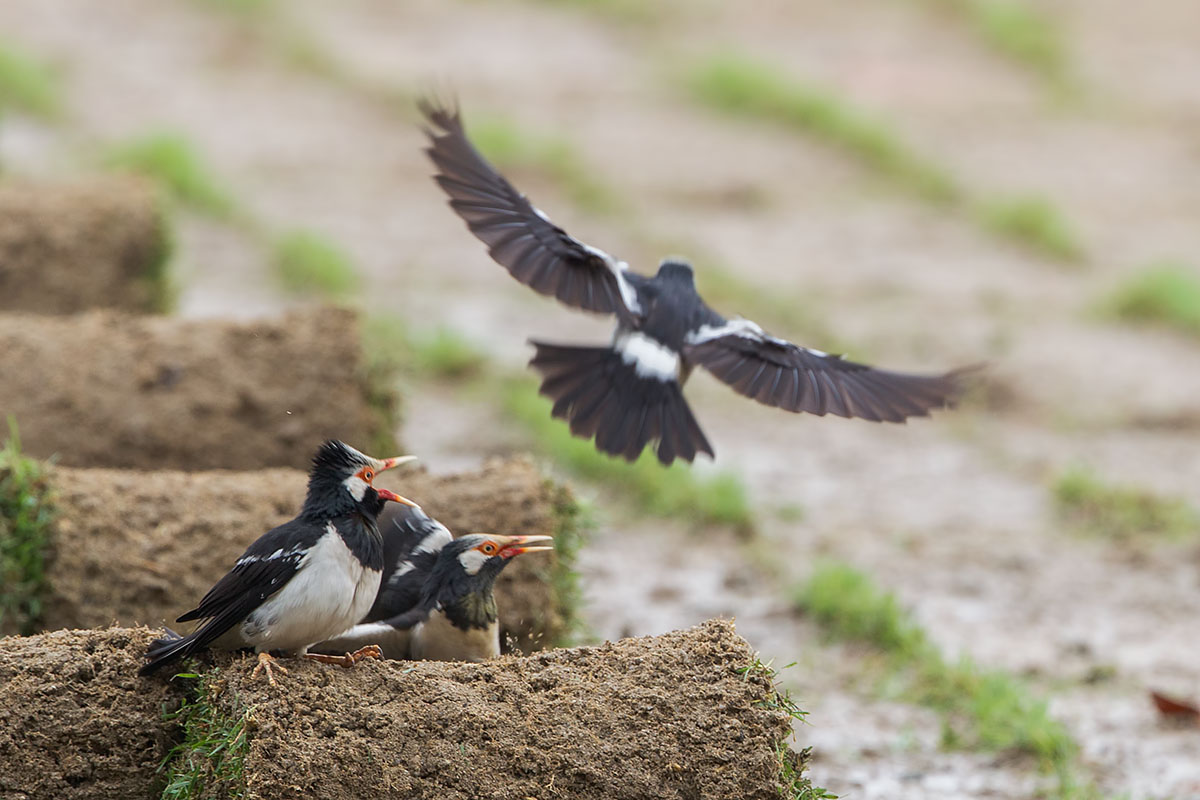 - The third party myna fly menacingly low towards the pair with the feet touching the soil.