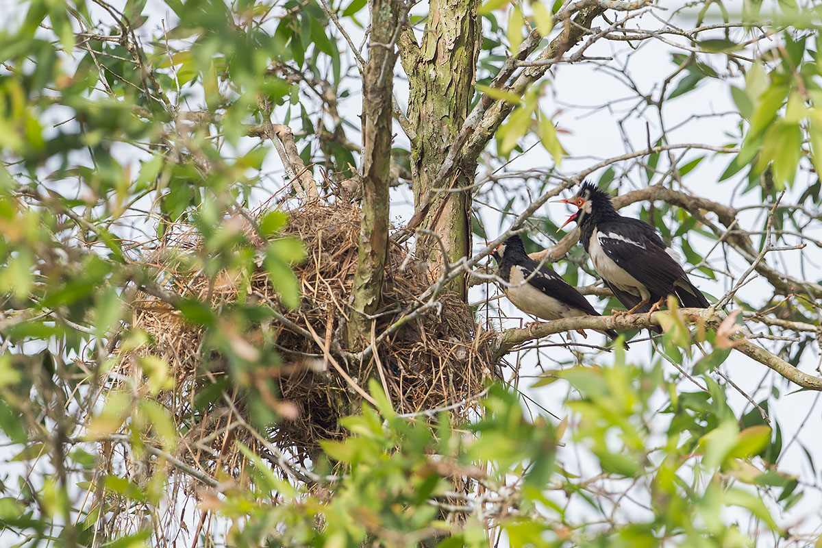 Subsequently observation revealed at least three birds as well as a nest, at a tree next to the golf course. The Pied Mynas were feeding on the lawn of the golf course, together with a mixed flock of Javan Mynas, Common Mynas and wintering Eastern Yellow Wagtails.