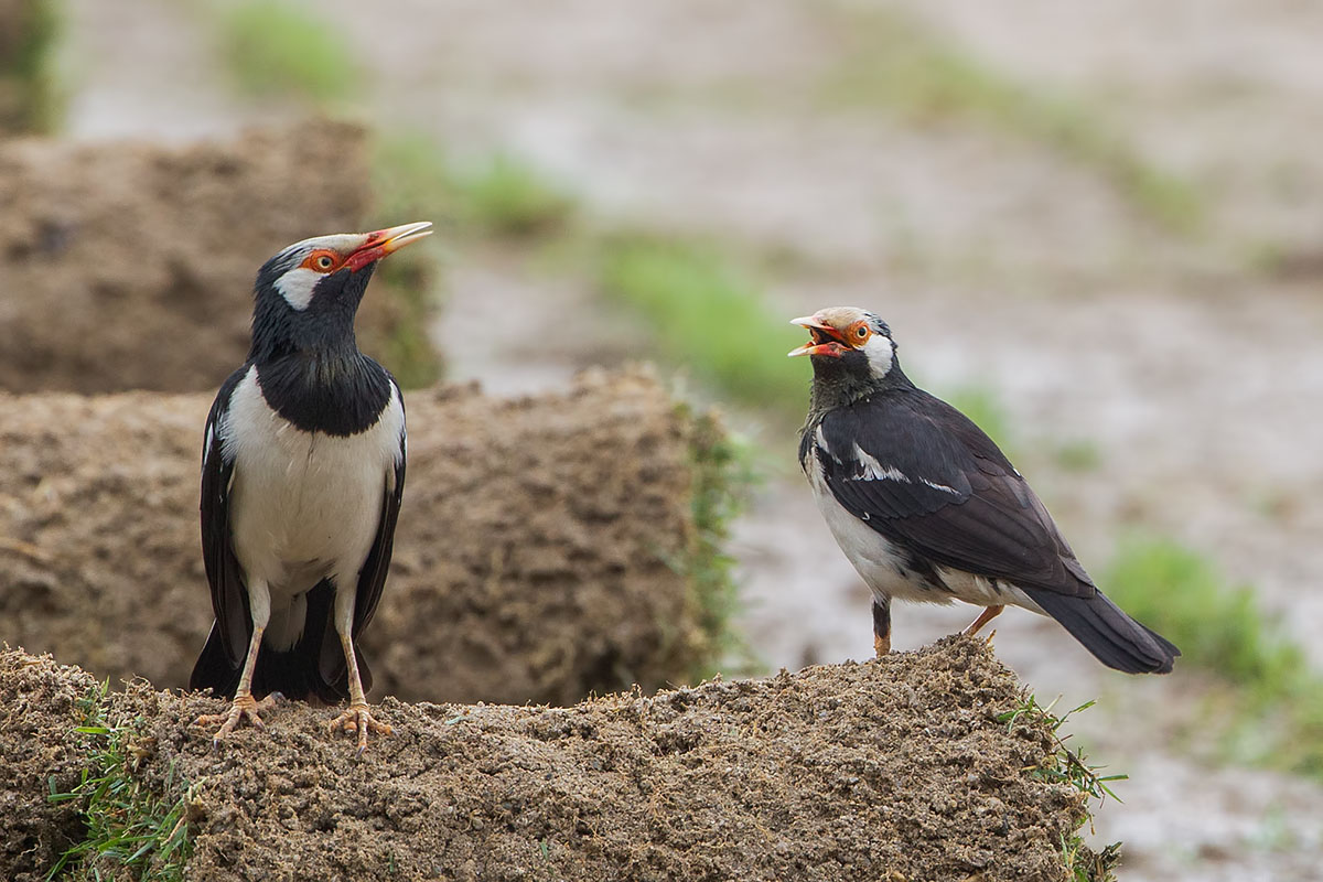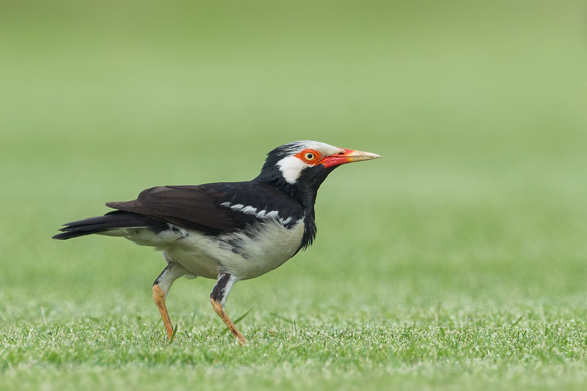 - A Pied Myna feeding on the mowed lawn of the golf course together with a mixed flocks of mynas and wagtails.