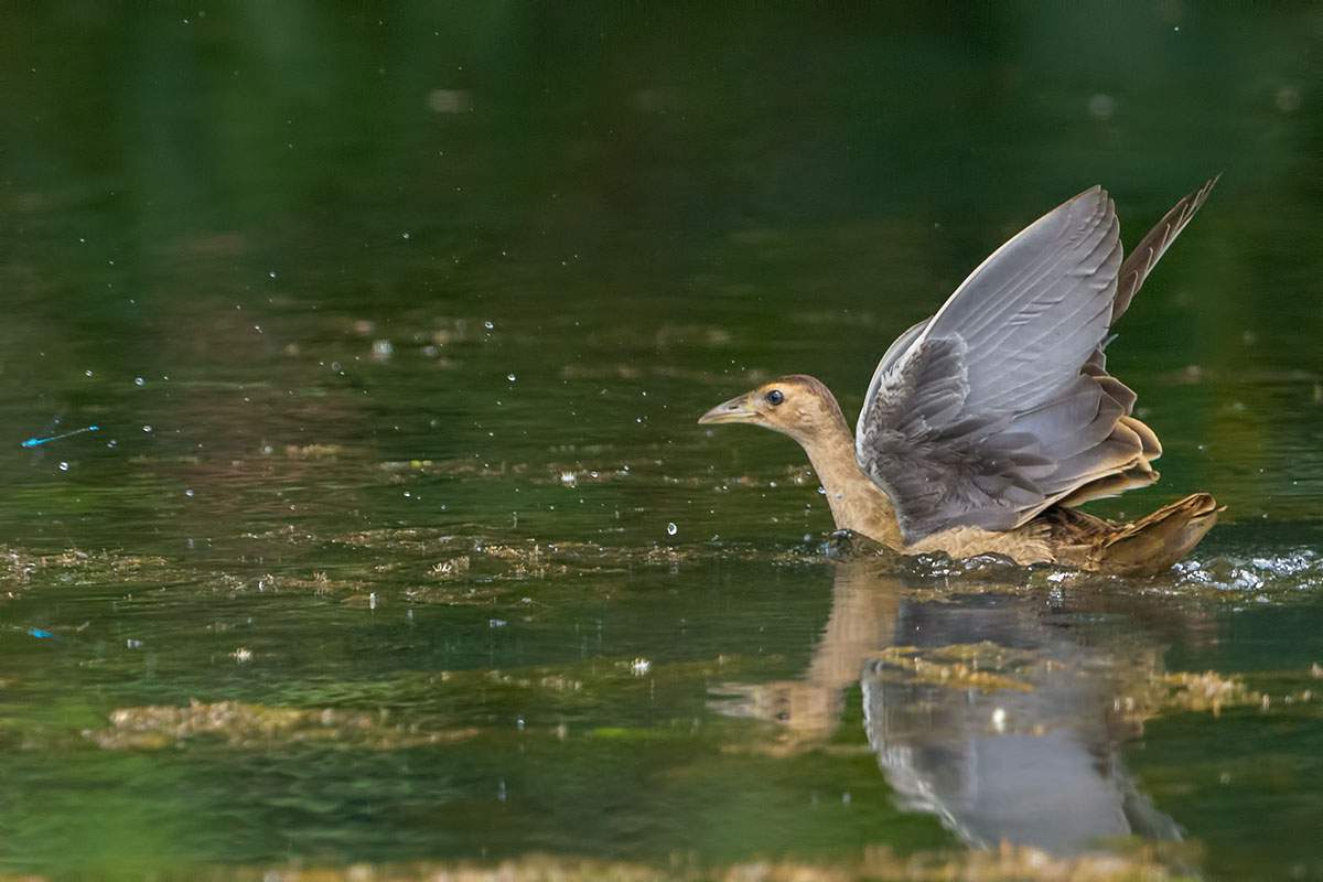 - A landing shot with water sprayed out, and the seldom seen underwing showing. Unfortunately the scene was dark. But I managed to capture this as well as a blue dragonfly at the right edge of the photo.