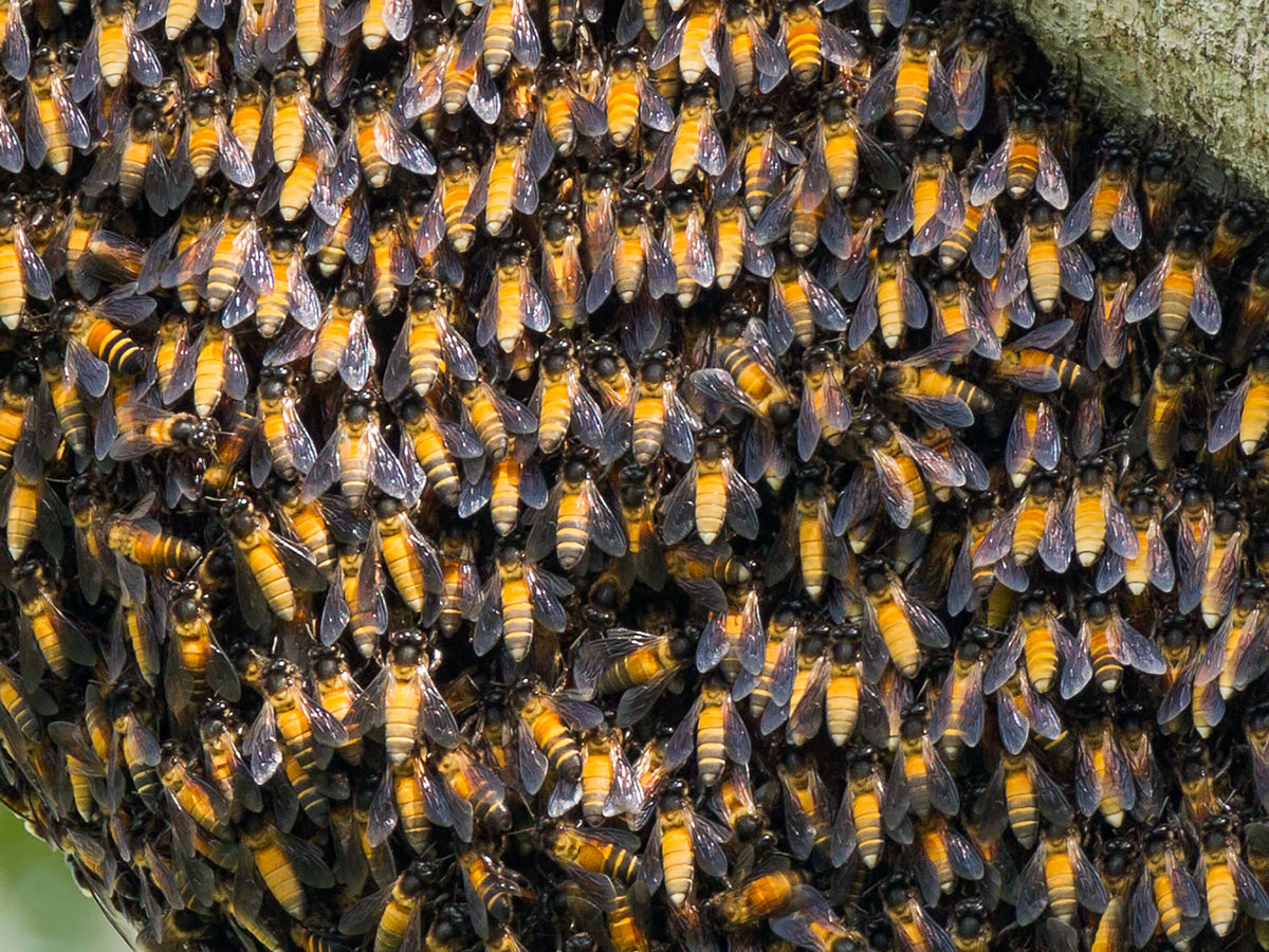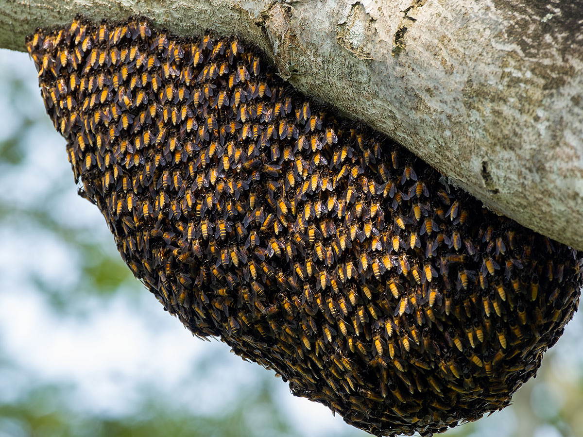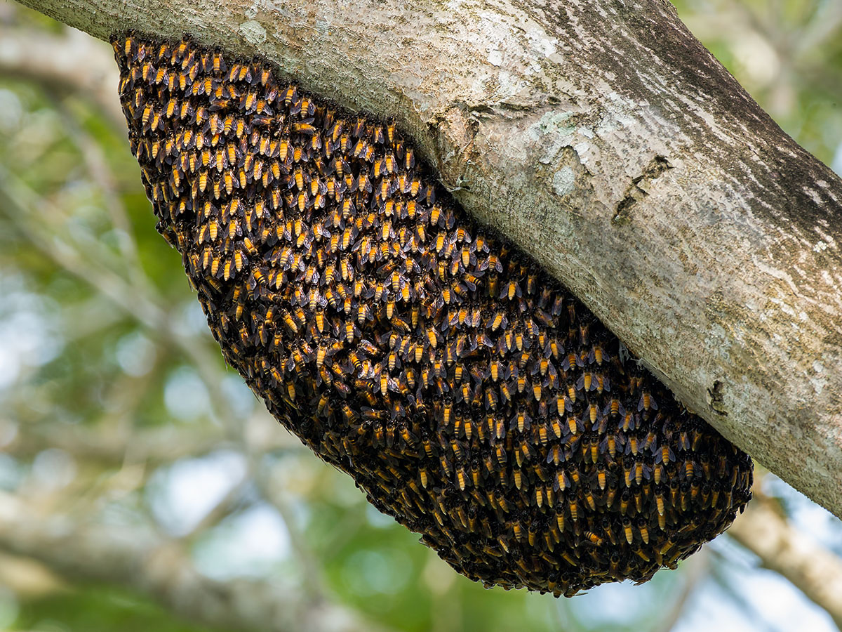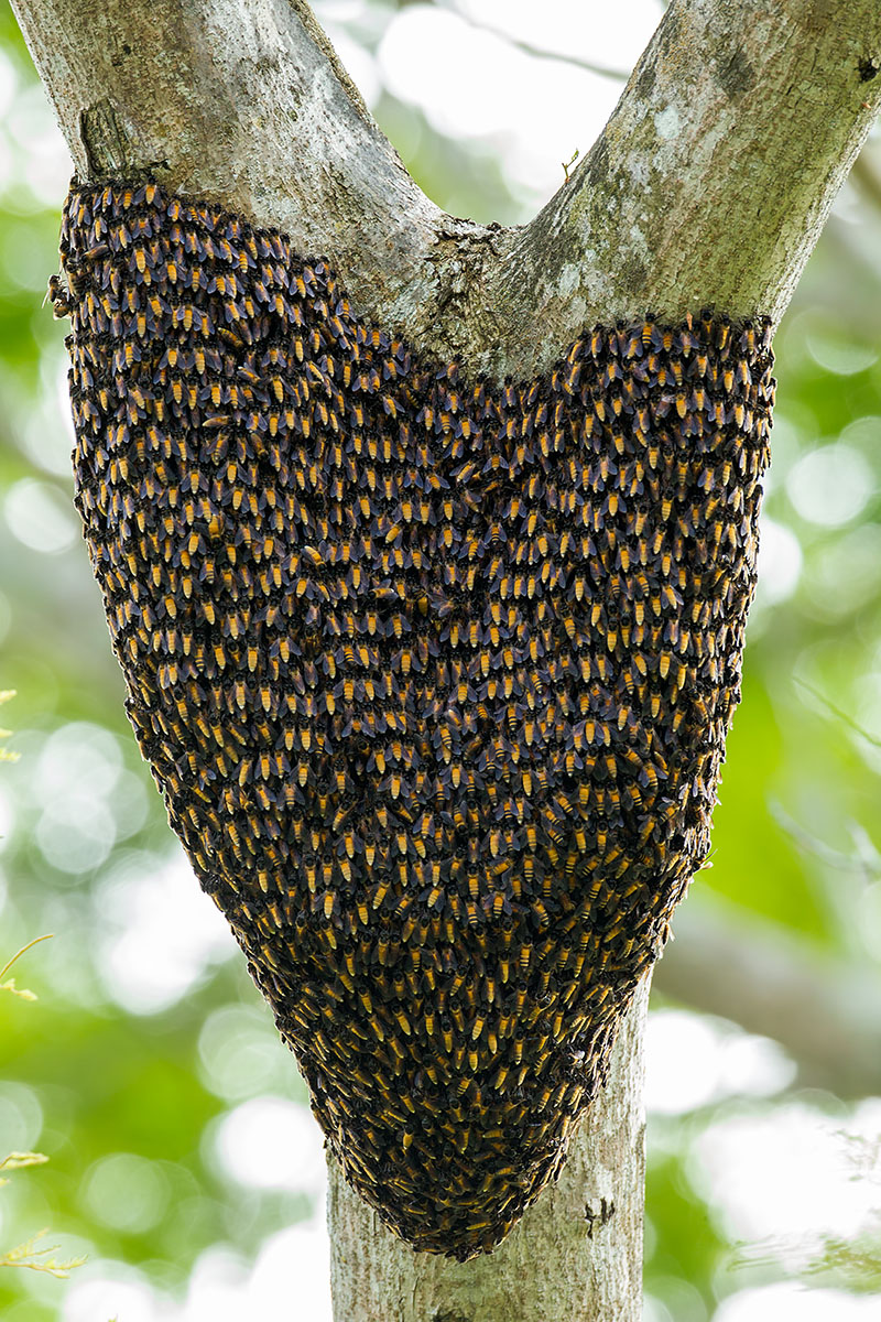 The Giant Honey Bees (Apis dorsata) is a honey bee common in South Asia and South-East Asia. These bees migrate seasonally. They nest in the open on tree branches or trunks and even on balcony of buildings2 (link). There is much to fear about them. Unlike their more docile cousins the European or Asiatic Honey Bee, they are rather ferocious especially near their nest or provoked, and will collectively swarm their target causing multiple potentially fatal stings3 (link). Killing of a single bee will cause pheromones to be released signalling further aggression. In other words, when you spot them, getting away will be the wisest decision.