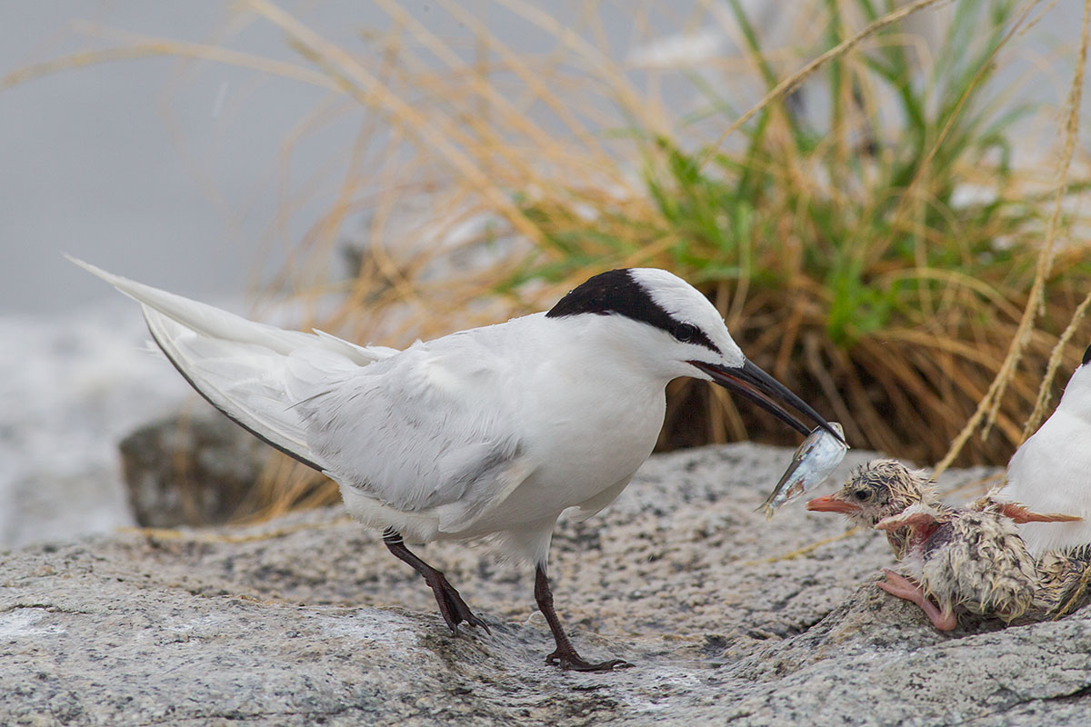 - A Black-naped Tern (Sterna sumatrana) feeding a recently hatched chick. It likes to breed at the offshore rocks near the mainland.