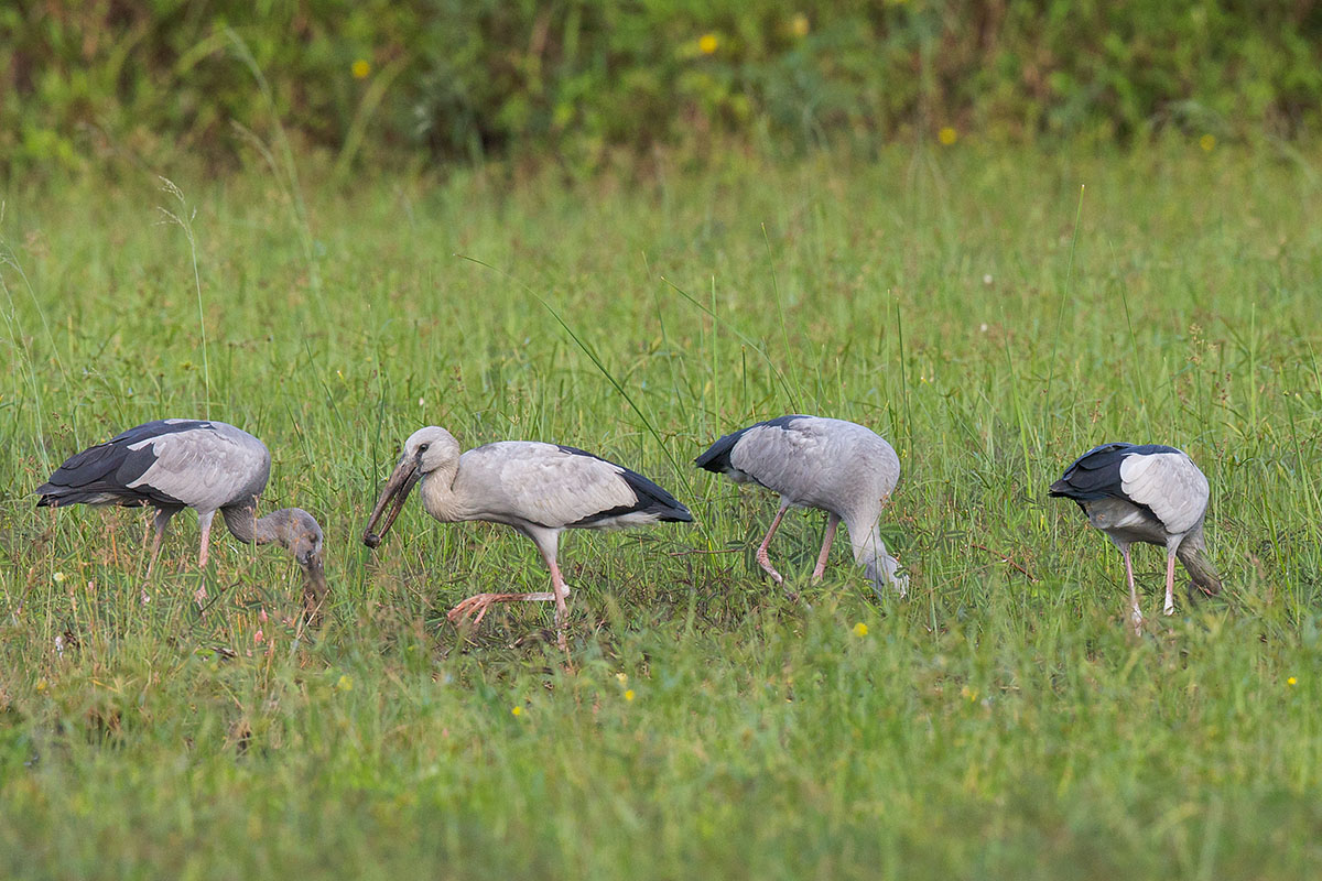 - Group foraging of the openbills. Pictured here are four birds, although a total of six birds were seen.