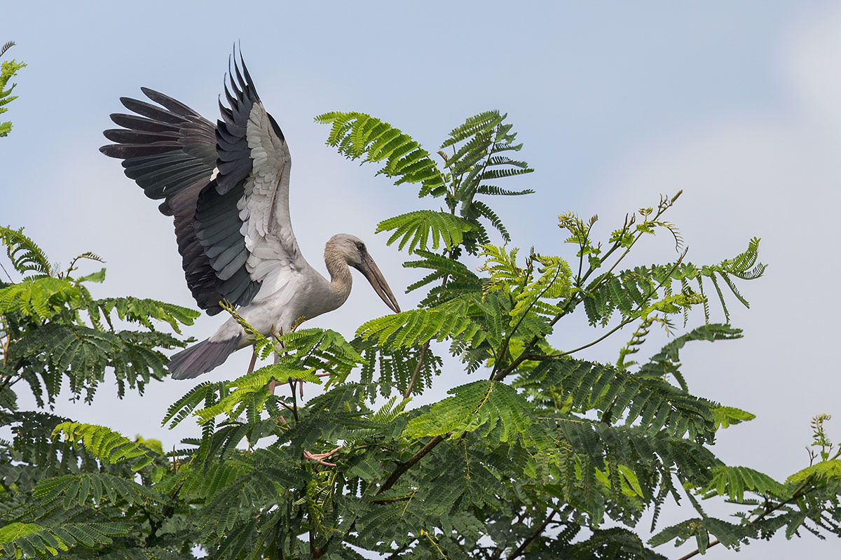 - Landing on an albizia tree nearby after a meal. The openbills have been observed to roost at the trees for protection.