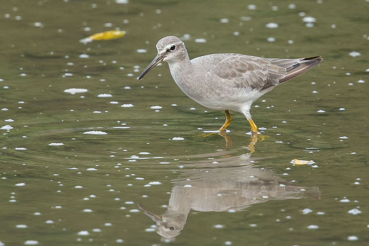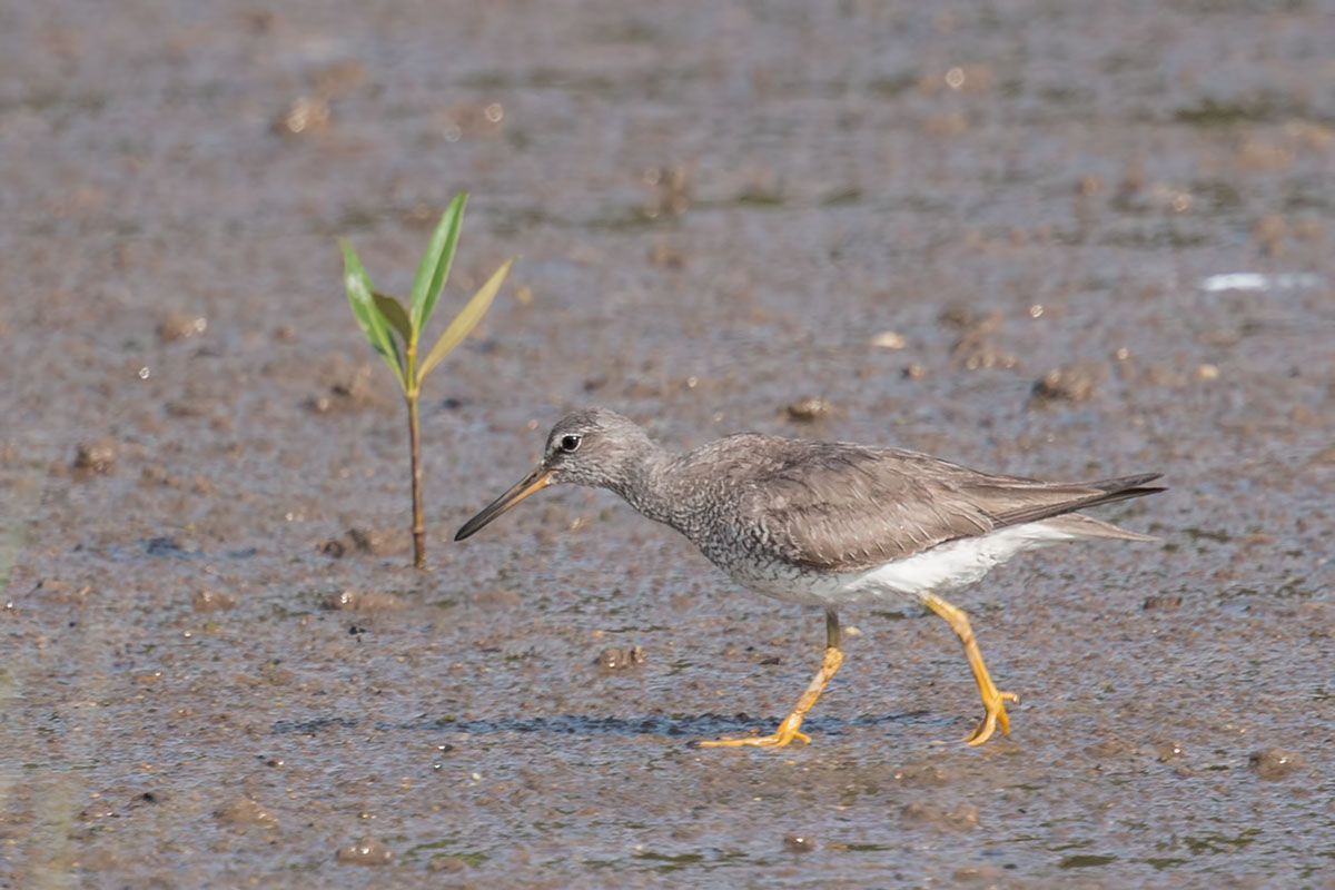The Grey-tailed Tattler has almost the same shape and size as the much more abundant Common Redshank and they like to mingle with the Redshanks for protection. However they can be told apart by a few features. Firstly, they have short yellow legs instead of the longer reddish legs of the Redshanks. As with the legs, the bill is also yellowish base. The white eyebrow stripe (supercillium) extends beyond the eye and contrasts with a prominent dark loral stripe which also continues a little behind the eye. This contrast is really apparent compared to the Redshanks. They also have unpatterned, greyish wings and back.